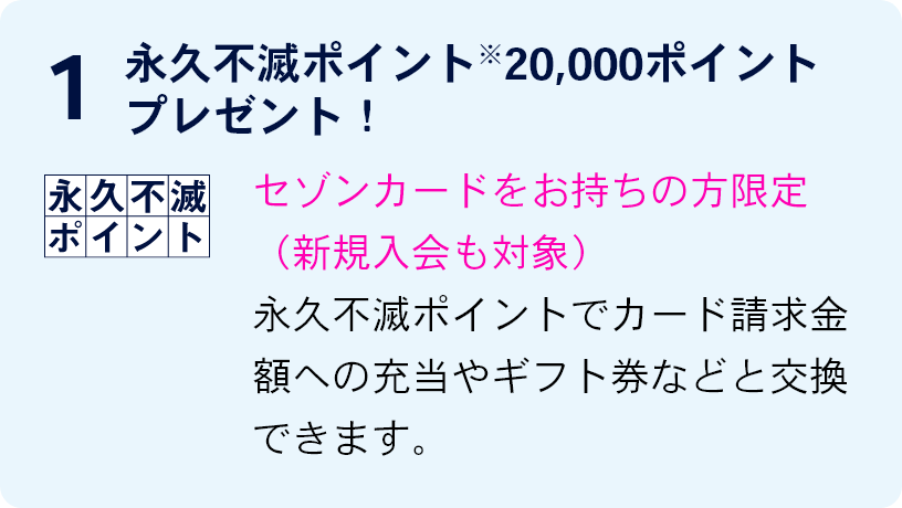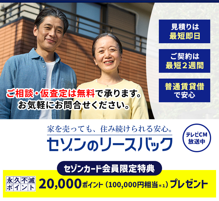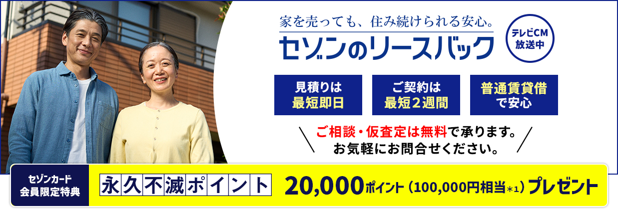 ・本特典は「リースバック契約が成立し、契約成立時に(株)クレディセゾン発行の永久不滅ポイントが貯まるカードをお持ちの方 」が対象となります。